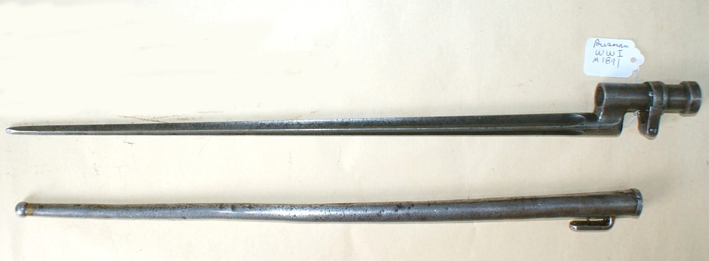 (2619)- Russian WW1 M1891 socket Bayonet, attached to the russian with a muzzle ring. Rare German/Austrian steel scabbard. Good condition. $350.00 Can shipping.